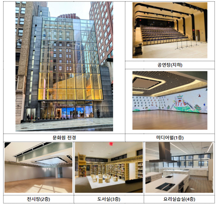 ‘뉴욕코리아센터’는 연면적 3,383㎡, 지하 2층부터 지상 7층 규모의 건물 전체를 사용한다. ▴지하에는 공연과 영화 상영을 위한 190석 규모의 공연장, ▴1층에는 미디어벽(미디어월), ▴2층에는 전시장과 정원, ▴3층에는 도서실, ▴4층에는 요리강습실 등을 갖춘 종합 문화예술 공간이다. 지난 3월부터 6월까지 시범운영(Soft Open) 기간에 방문객 8천여 명이 찾아, 앞으로 뉴욕 내 한국문화 체험의 명소로 발돋움할 것으로 기대된다. 특히 입주 기관인 한국문화원과 한국관광공사, 한국콘텐츠진흥원이 협업해 세계문화를 선도하는 국제도시 뉴욕을 찾는 전 세계인을 대상으로 한국문화‧관광‧콘텐츠에 대한 종합 서비스를 제공해 국가 브랜드 가치를 높이고 문화콘텐츠 수출과 외래관광객 유치 증대 등 경제적 파급효과를 창출하는 데에도 기여할 것으로 보인다.