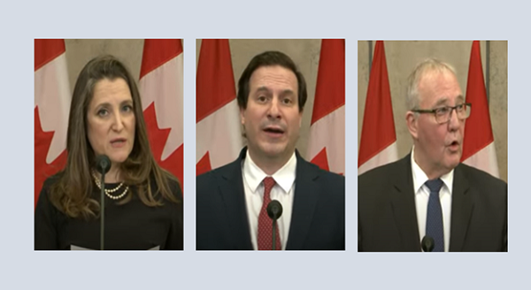 하원에서는 발의된 비상사태법을 놓고 논의가 수일간 진행되고 있는데 오늘 17일 목요일에 프리랜드 재무장관은 마르코 멘디치노 공공안전 장관, 빌 블레어 비상대비 장관과 함께 기자회견에서 다시 한번 강조했다.