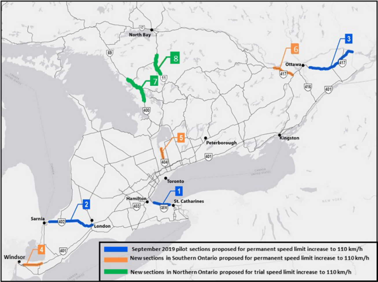 2019년 시범 프로젝트에서 온타리오 고속도로의 특정 지역에 속도를 높였는데 시속 100km로 제한된 구간과 110km 로 제한된 6구간의 스피드와 충돌 경향이 비슷하게 발생했다고 정부는 전했다.