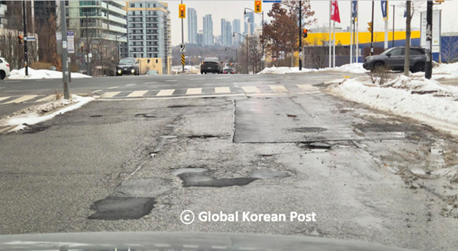 최근 영상 기온이 나타나면서 쌓였던 눈더미들이 녹고 있지만 거리 곳곳에서 도로의 표면이 많이 손상된 걸 발견할 수 있다.