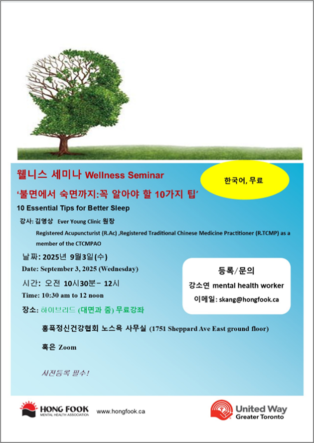 홍푹정신건강협회에서는 토론토 한인의 건강 증진을 위해 웰니스 세미나(Wellness Seminar)를 개최한다.