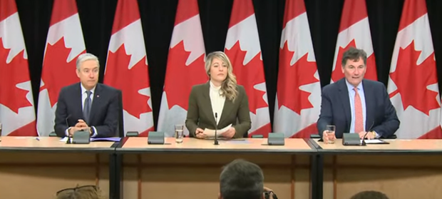 상호 관세 발표에 나선 연방장관들 (오른쪽부터 도미니크 르블랑, 멜라니 졸리, 프랑수와-필립 샴페인) / CPAC