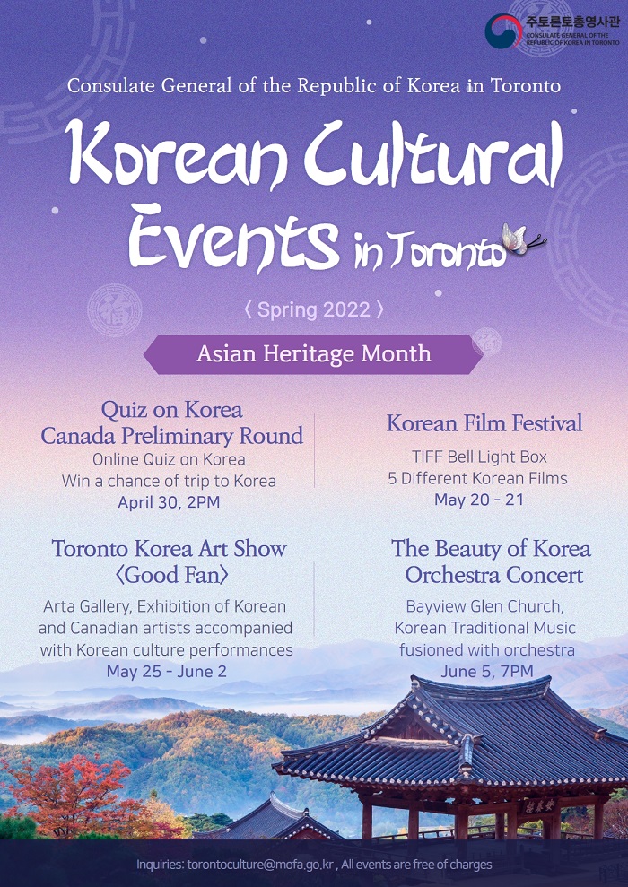주토론토총영사관은 2022년 5월 캐나다 아시아문화유산의 달을 기념 하여 캐나다 내 한국문화를 알릴 수 있는 다채로운 문화행사를 개최할 예정이다.