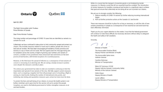 22일 덕 포드 온타리오 수상은 프랑수와 르고 퀘벡 수상과 함께 저스틴 트뤼도 총리에게 공동 명의로 서한을 보냈다고 밝혔다.