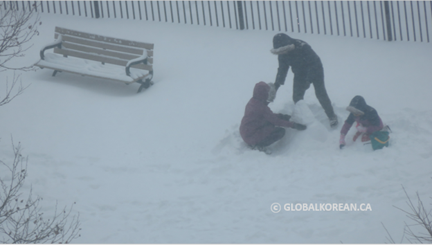 눈이 내린 둘째 날, 엄동설한에도 불구하고 야외로 나온 한 가족이 눈에 띄었다.