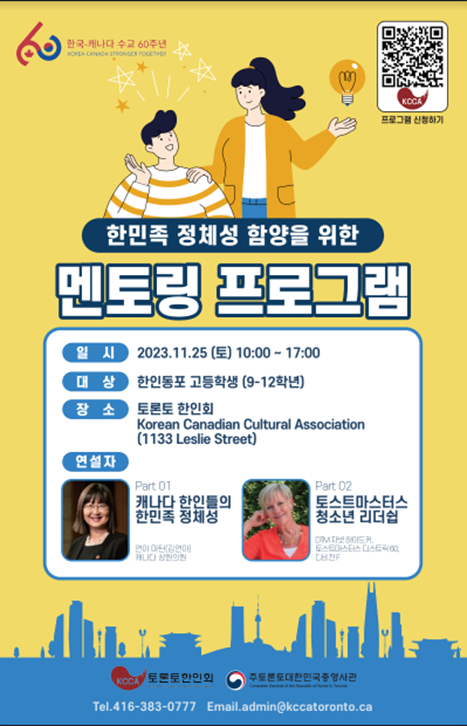 또, 토론토한인회는 한국-캐나다 수교 60 주년을 기념하여 청소년들을 대상으로 ‘한민족 정체성 함양을 위한 멘토링 프로그램’을 11 월 25 일 (토) 오전 10 시~ 오후 5 시  한인회관에서 개최한다. 한인회와 주토론토총영사관이 함께하는 이번 행사는 한인동포 청소년 (9-12 학년)들을 위해 초청 연사의 강연 및 지도강사진의 멘토링 프로그램으로 진행된다.  김연아 캐나다 연방 상원의원의 개강 강의 및 질의응답 시간과 또 커뮤니케이션 및 퍼블릭 스피킹에 대한 프레젠테이션 및 액티비티 진행은 토스트마스터스 인터내셔널의 자넷 하이드커 씨가 지도강사로 참여한다. 영어와 한국어로 진행되며 식사와 다과가 제공된다.  한인 동포 고등학생 중 참가 희망자는 사전 참가 신청(QR code)을 하면 된다.