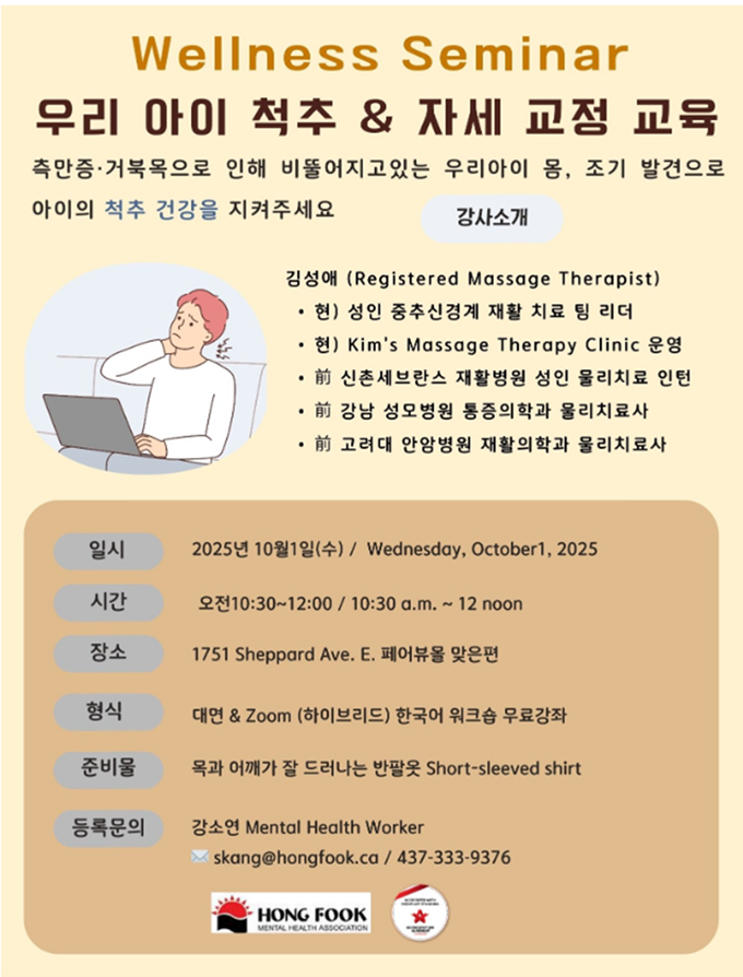 홍푹정신건강협회는 오는 10월 1일(수)에 척추 측만증과 거북목에 대한 무료 세미나를 진행한다.